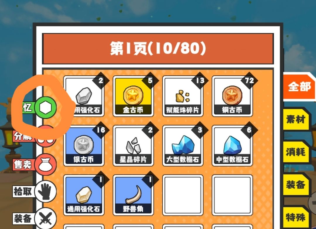 5,背包是特别容易满的,重点是背包里的一键使用所有记忆,别管干啥用的,一键使用就对了,至于其他的东西,除了古币和强化石还有稀级别以上的附魔石和赋能球球,其他的能装的装上,装不上的都可以卖了。