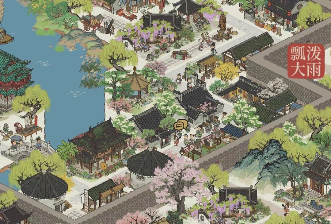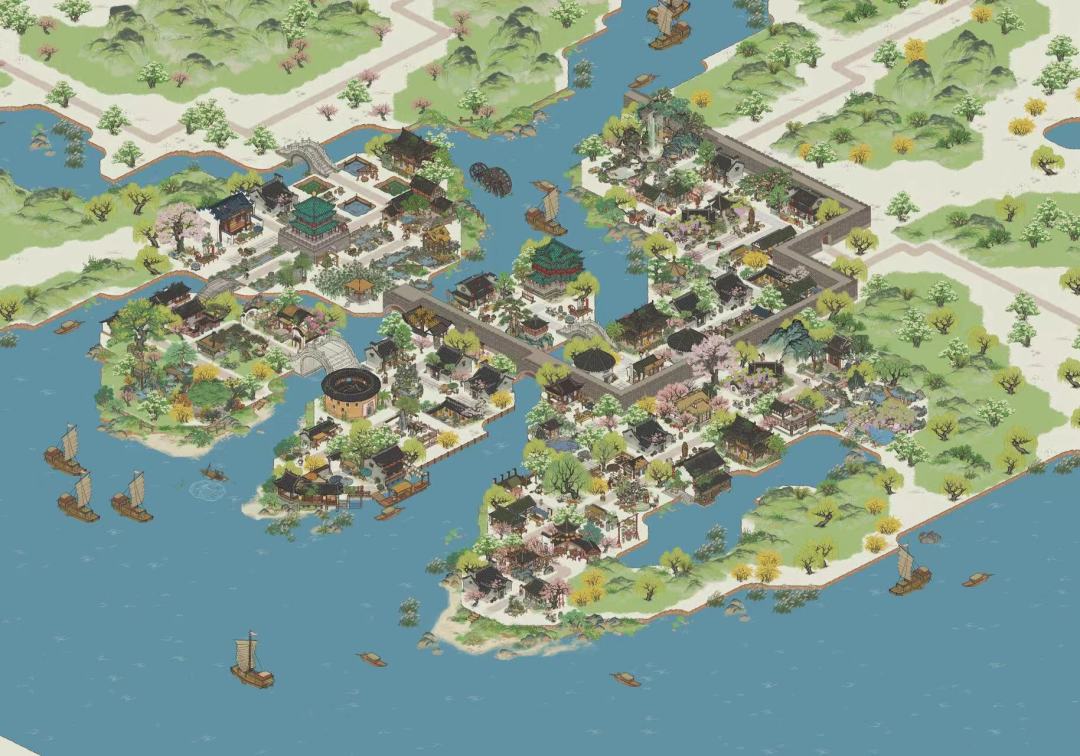 足年堤:在此地建造青砖仓库扣题,并摆放各类商铺打造欣欣向荣的生活场景,祈愿丰衣足食,盈余年年。