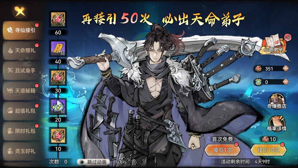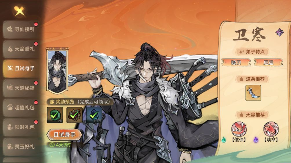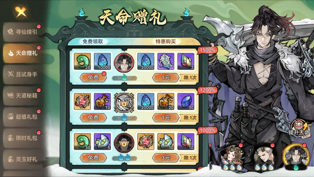 活动期间,还会开启限时天命赠礼,将仙缘弟子【卫寒】的天命提升至指定等级,不仅可以领取免费礼包,还可以购买直购礼包。