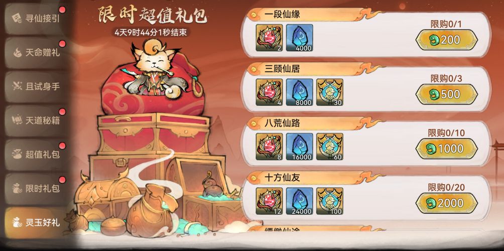 活动期间,超值礼包页面每天解锁3个不同额度的超值礼包,一次性购买可享受8折优惠,灵玉好礼和限时礼包页面同时还会开启不同额度灵玉礼包和不同额度的限时直购礼包可供大家购买。