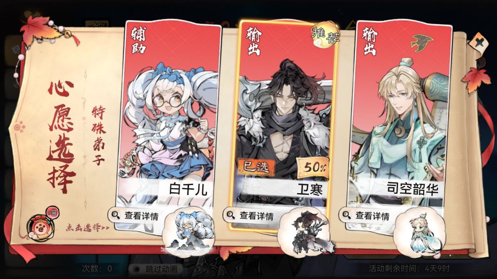 活动期间,消耗道具【寻仙令】可以抽取专属弟子,从卫寒、白千儿、司空韶华中选择一名专属弟子作为心愿弟子。
