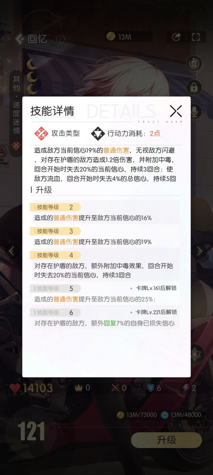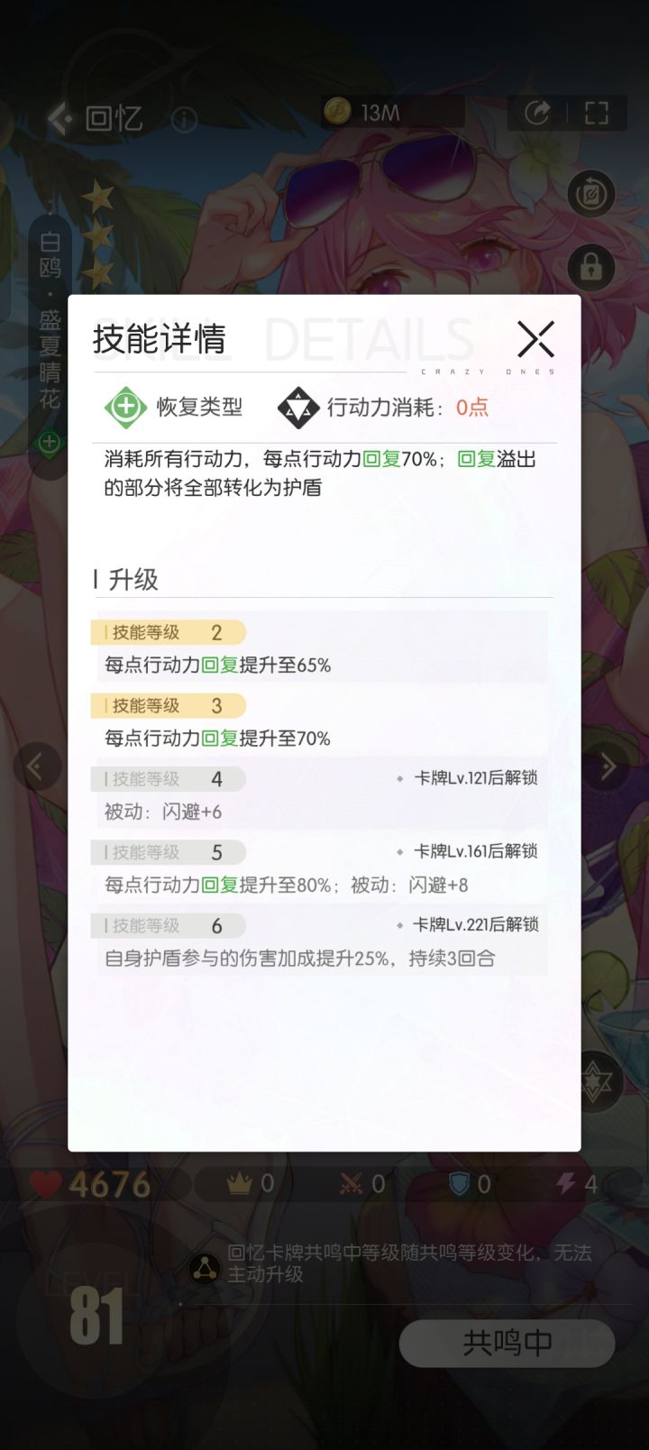 比如盛夏晴花这张卡,刚玩可能会以为他用两点行动力可以把信心回满,实际上他是倍率数值,也就是基数x0.6,花三点行动力大约回复量为五分之一总信心