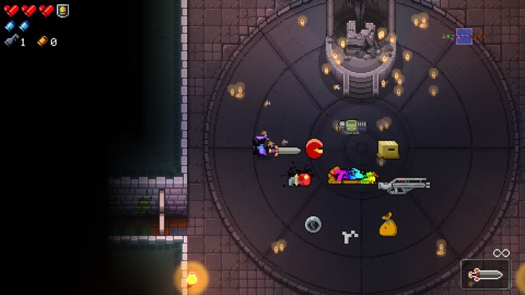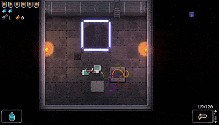 在进入地牢后,可以通过不断的重开,进行随机Roll取不同的武器和道具。矛盾进入地牢时拥有:一把初始武器、一把随机武器、一个随机道具。