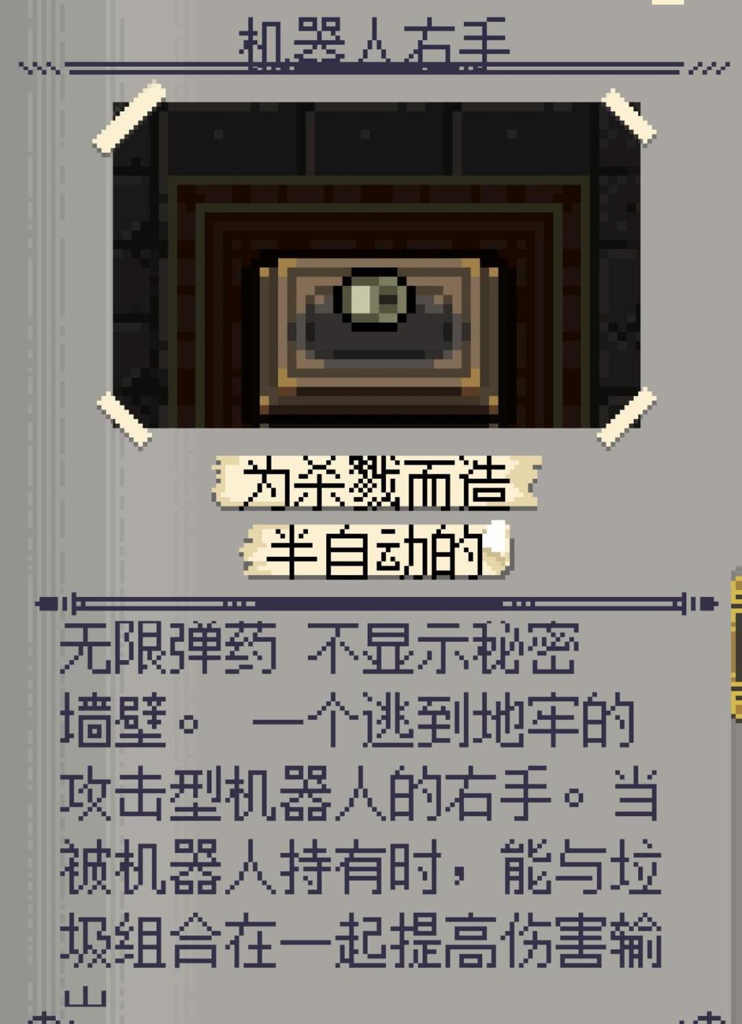 那么角色性能方面,机器人子弹的武器可以说十分优越,高射速低分散的20弹容量十分豪华。在装备说明中也暗示了打碎宝箱获得的垃圾能够提升机器人5%的全局伤害(枪弹+水电)初始武器:机器人右手弹容量:20发单发伤害:5子弹速度:25射程:20子弹分散:7%