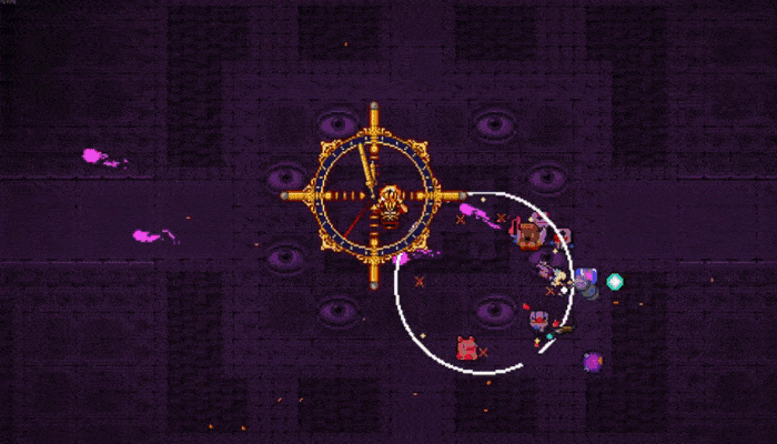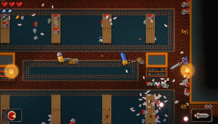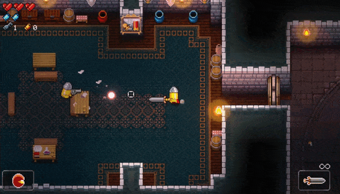 作为《挺进地牢》中最为强力的初始武器,当子弹满血时挥动亵渎会射出剑气,而挥动的亵渎则会在挥砍到敌方发射的子弹时将其泯灭。并且,挥砍和剑气的伤害是分别计算,能够同时触发。武器挥动时会有一个小步的前进位移,在悬崖边缘时需要注意,同样,也能够利用前移时向后翻滚达成小幅度的翻滚位移。