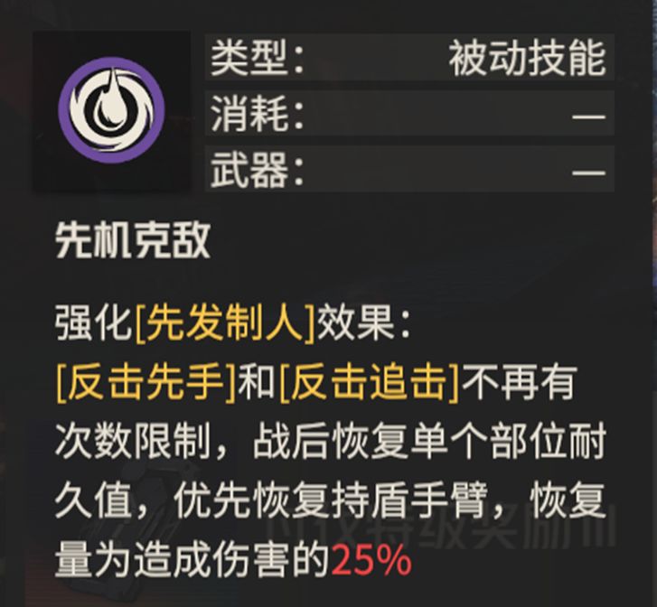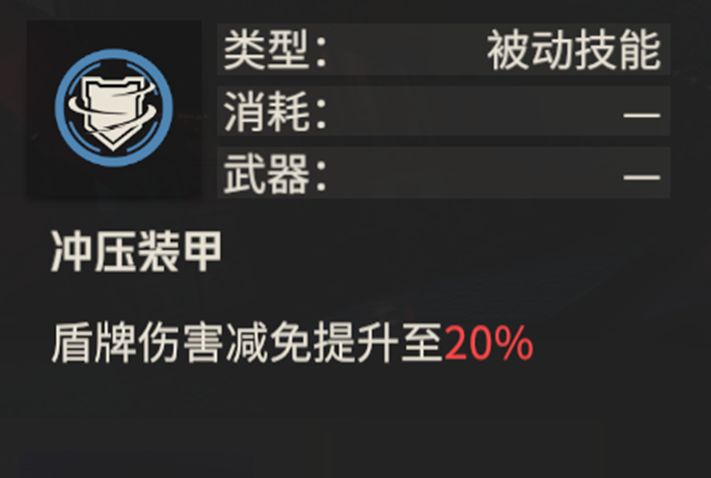 冲压装甲:通用性技能,简单粗暴,进一步提高盾牌免伤,极大强化守护者防御力。相信大家在战斗中,经常会遇到明明攻击足以打破敌人的盾牌,但是实际结算中,却会缺少些许伤害,这便是盾牌减伤的影响,而如今盾牌减伤再上升一个层次,这让敌人想要击破我方防御,更是难于登天。