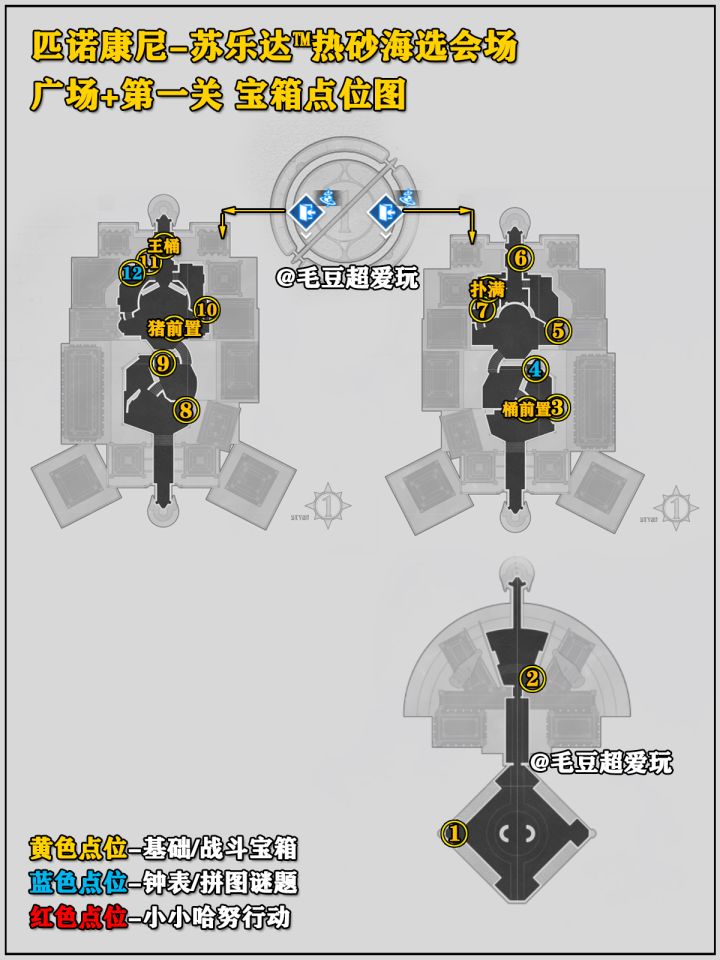 本期毛豆整理了2.2版本新增地图匹诺康尼-苏乐达™热砂海选会场的宝箱点位,“1关篇”包含广场、第一关左右两侧的宝箱收集,以及第二关开启隐藏的宝藏线索收集。第二、三关的宝箱收集路线请前往对应的收集篇。