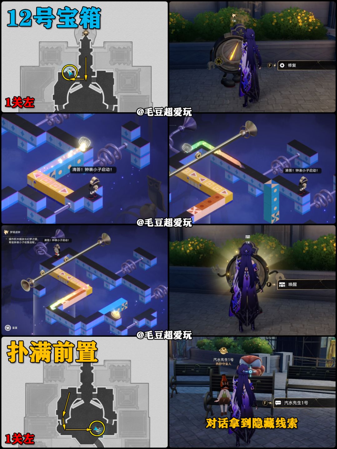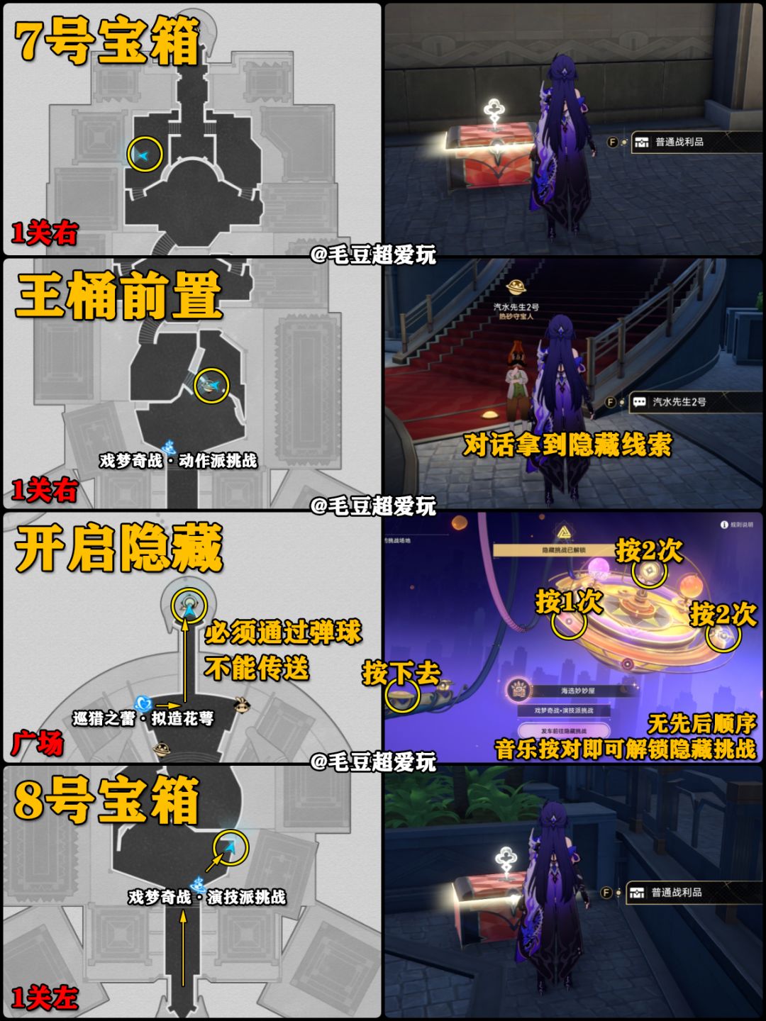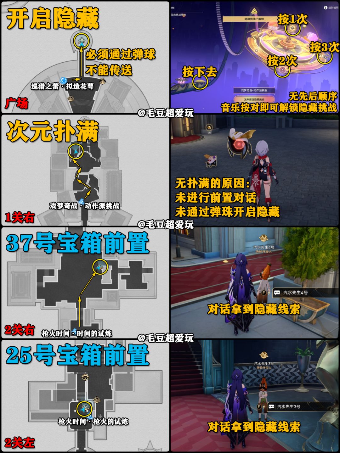 每个关卡都分为左右两边,每边都有一位热砂守宝人NPC,左右两边各拿着对立区域的隐藏线索,必须先与前置NPC对话获得线索,并通过前一关的弹珠机前往,获得线索后可通过弹珠机右下角的提示查看,点按相同音符开启隐藏关卡挑战,无法通过传送开启挑战关卡!