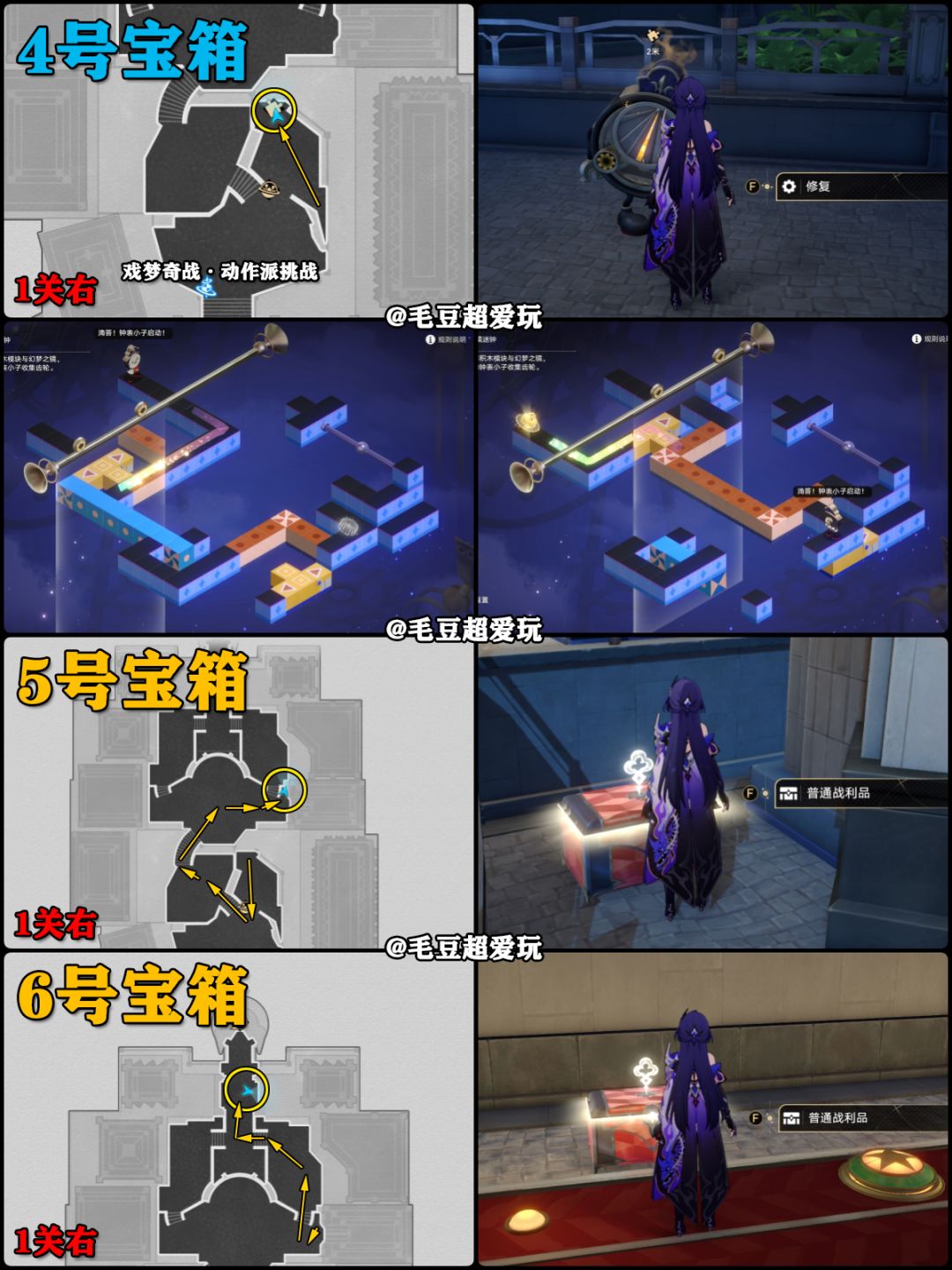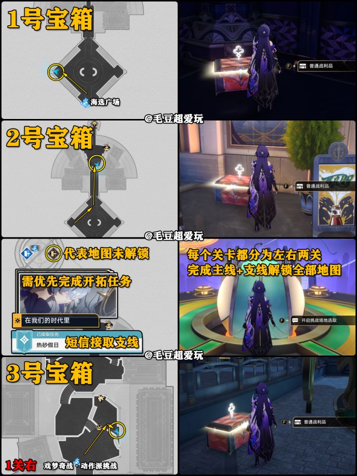 开拓者需要优先完成系列开拓任务《在我们的时代里》,支线任务《热砂假日》,每个关卡都分为左右两边,完成主线+支线开启全部苏乐达™热砂海选会场地图,毛豆根据颜色划分了宝箱类型,谜题、任务宝箱均不计入地图左上角显示的战利品。