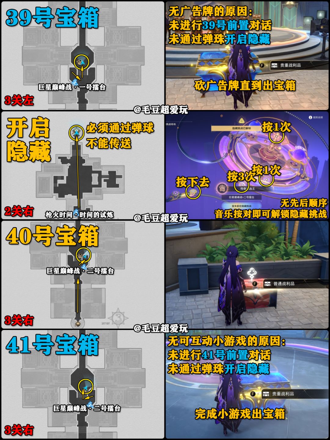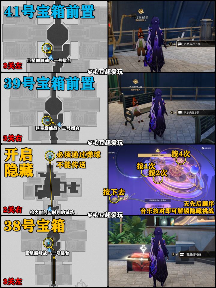 每个关卡都分为左右两边,每边都有一位热砂守宝人NPC,左右两边各拿着对立区域的隐藏线索,必须先与前置NPC对话获得线索,并通过前一关的弹珠机前往,获得线索后可通过弹珠机右下角的提示查看,点按相同音符开启隐藏关卡挑战,无法通过传送开启挑战关卡!