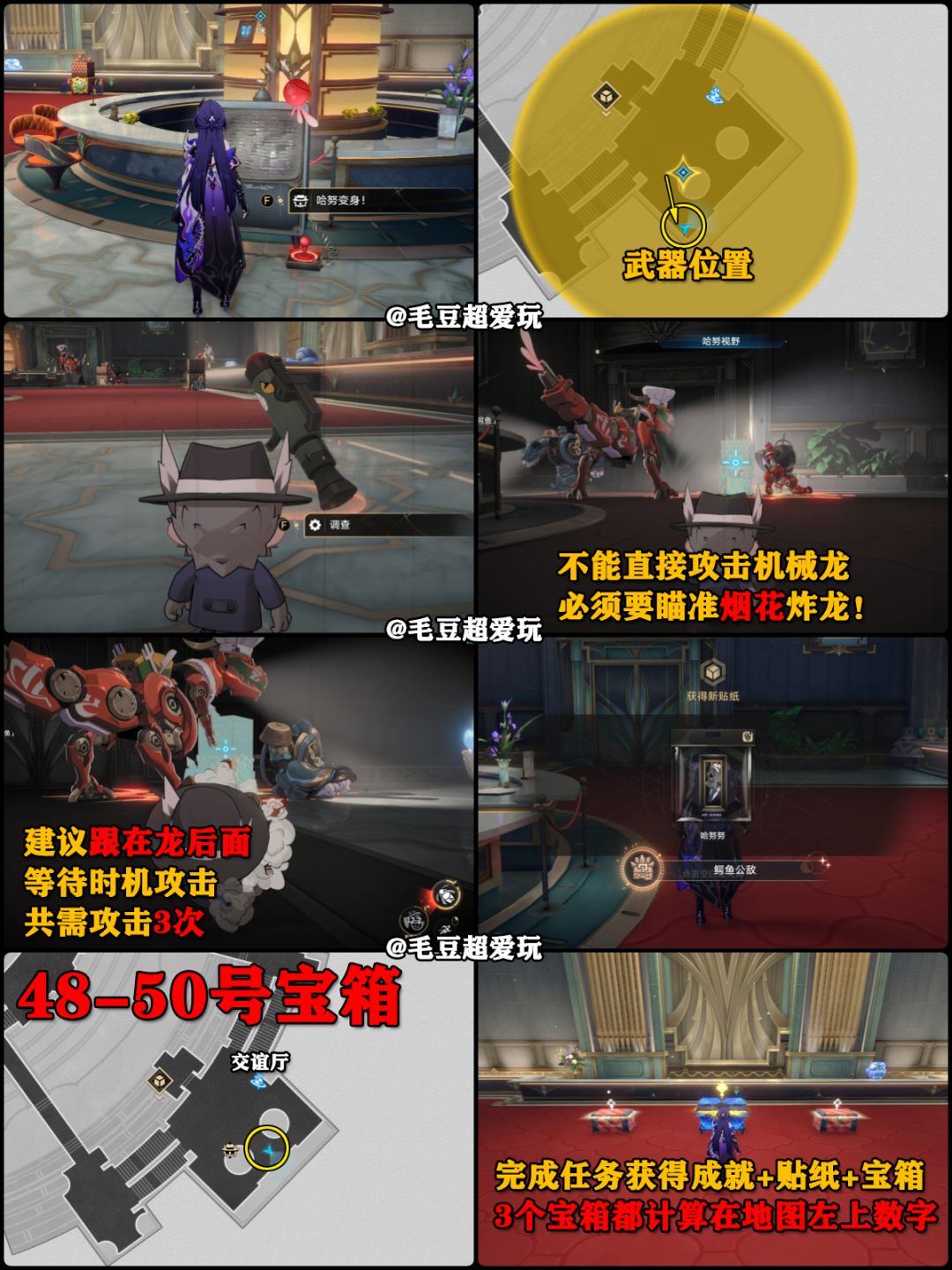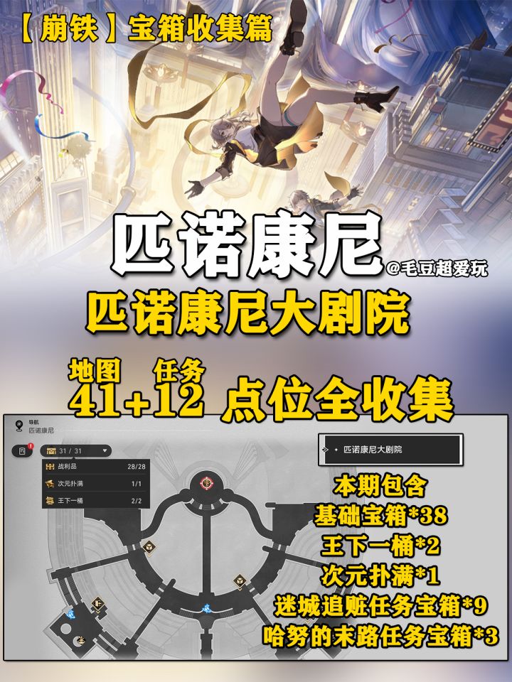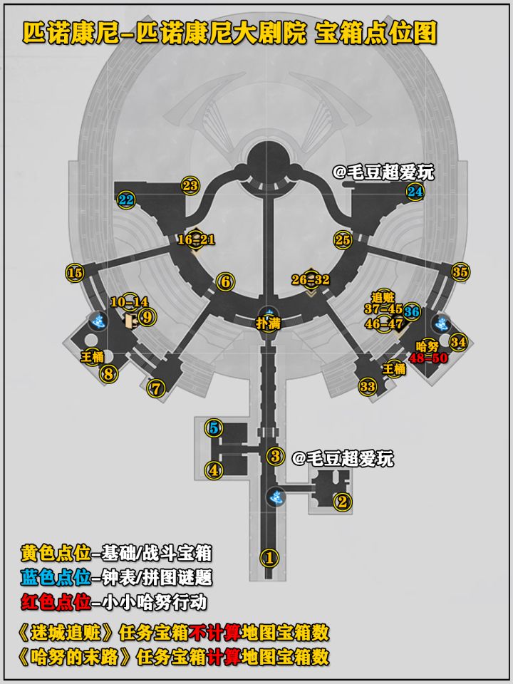 本期毛豆整理了2.2版本新增地图匹诺康尼-匹诺康尼大剧院的宝箱点位,完结篇包含46-50号的宝箱收集路线,36号及以前宝箱请看上、中、下收集篇,37-45号宝箱请前往《迷城追赃》任务宝箱收集篇。