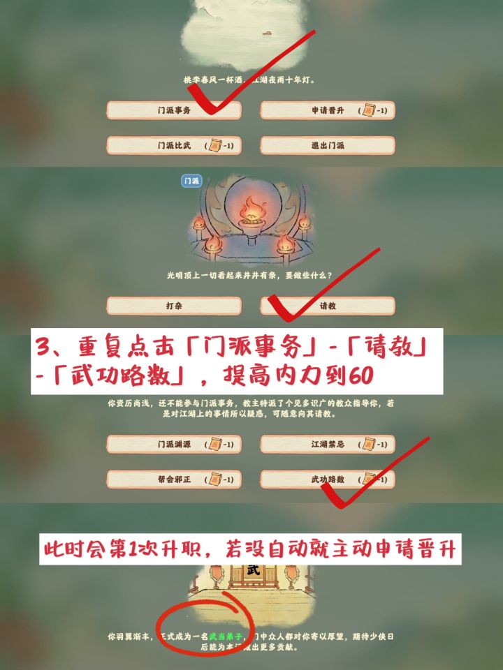 3、加入后,提升内力到60,然后晋升到一级职位(没有自动晋升的,主动申请晋升)(期间资产如果体魄低的买体魄,还行就买加内力/德行的资产)