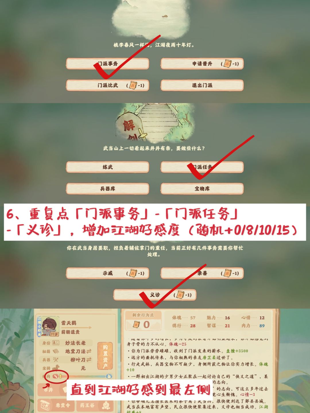 6、最后,再去点击「门派事务」-「门派任务」-「义诊」。一直重复义诊(随机江湖好感+0/8/10/15),一直重复到江湖好感度达到峰值。关注momo,不迷路~