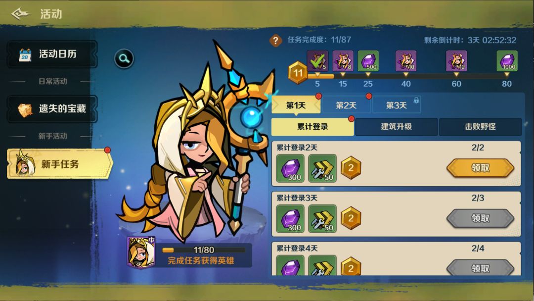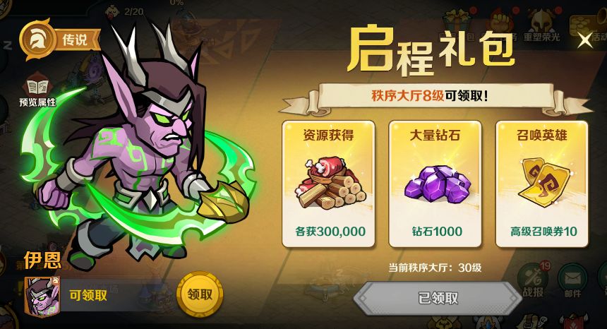 首日完成主城8级,即可获得60万基础资源、1000钻石和10连抽;次日登录,即可领取精灵族传奇英雄【伊恩】