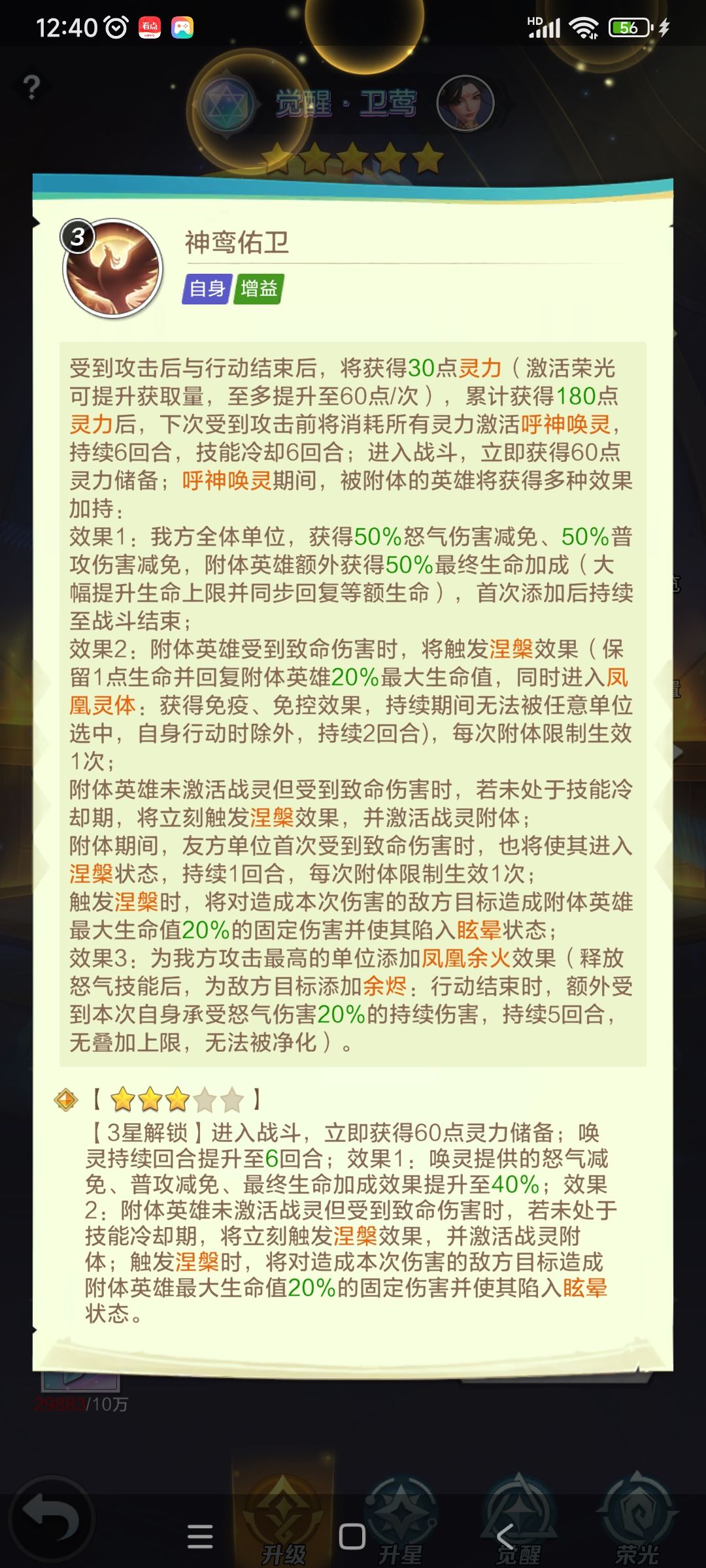 强大的恢复能力,三星不激活也能触发涅槃,五星后额外给除自身以外第一个致命伤害队友添加涅槃效果。玉环和嫦娥带都是绝配!