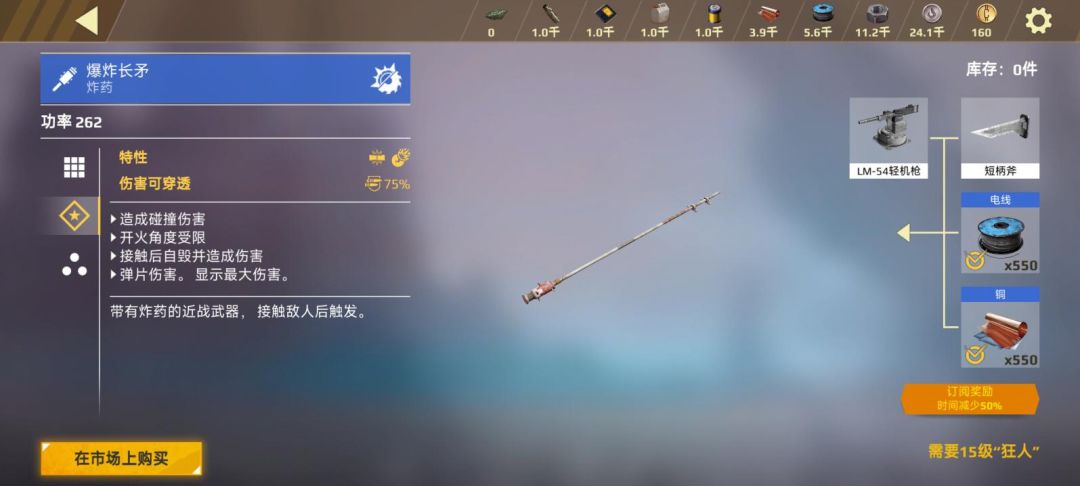 上图所示的是各位工程师获得的首个稀有品质“爆炸长矛”,而这类武器的作战风格则显得非常的简单、粗暴且狂野:通常来讲在设计战车时就会携带隐形模块,看见敌人了就启用隐形模块,然后飙车冲上去冲撞引爆长矛。作为一次性武器,爆炸长矛具有非常优秀的伤害,但在引爆后则失去了几乎所有作战能力,最多就是使用战车的自爆功能真正意义上的再寻找一个敌人同归于尽。