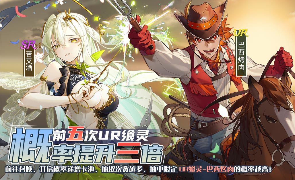 活动描述:活动期间,开启概率递增卡池,UR飨灵-巴西烤肉和SR飨灵-苦艾酒限时加入卡池,御侍大人使用专属道具进行召唤,该卡池UR飨灵抽取概率大幅度提升,并且随着抽取次数的增多,UR飨灵-巴西烤肉的抽取概率也会随之提升。