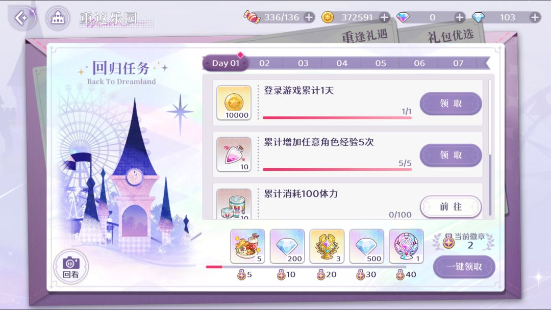 活动期间每日04:00会刷新新一天的任务,完成任务会获得对应奖励和一枚回归徽章,回归徽章收集达到一定数量,可领取额外进度奖励。在【回归任务】中,可获得乐园门票、夜光钻及完美结晶等丰富奖励!