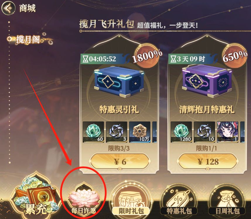 建议大家理性消费,这里只说一个小技巧,每天仅购买6元体力的玩家解锁了每日许愿,可以利用找回功能购买2次6元体力礼包,要注意尽量不要影响等级解锁的副本