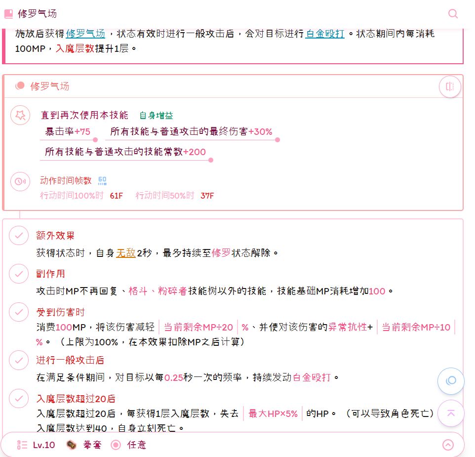 点1还是点10看自己需求,减伤是不变的,区别就是修罗提供的爆率和关闭修罗后的回蓝效果,点1只有7.5爆率,点10是75,约等于点10自带百爆,然后点1的回蓝是总攻回的0.1回蓝,点10是总攻回。个人建议拉满,如果你有滑雪拳的话点1也行。