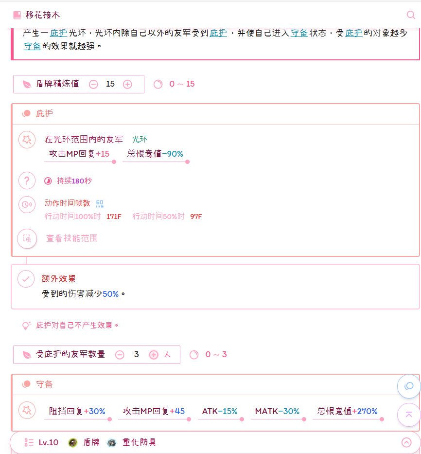 匠坦的核心之一,全自动的手动阻挡,能触发手动阻挡的一切效果,包括格挡附带的异抗(格挡附带异常抗性=格挡力格数×100%)、回蓝(回复的MP=总攻击魔法回复×(1+当前格挡力格数/100)其中当前格挡力格数的部分最多为100。即最多回复总攻回×2。)以及破格挡的无敌和免死。但应注意此格挡不能格挡地刺天火,也无法在这两种伤害下触发免死和无敌,不能无脑硬吃。ps:格挡回蓝可以在修罗状态中回蓝