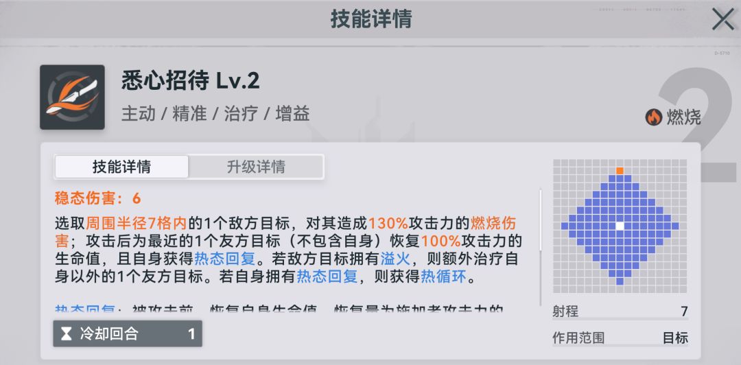 首先是一技能悉心招待,高达6点的稳态伤害且附带燃烧克制,破稳能力一跃成为前排行列,一回合的冷却使其无论作为开局起手还是对单体友方的紧急治疗和搭配固件用于单体驱散都是非常不错的选择。且还是自己热态回复的稳定获取途径之一,这个buff对于桑朵比较重要,至于为什么我后面会提到。
