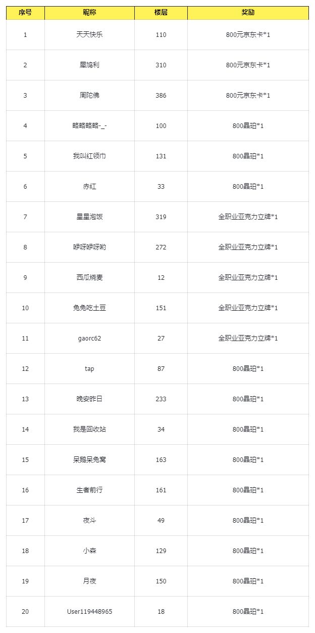 恭喜以下幸运的冒险者获得活动奖励,请中奖的冒险者打开私信功能,工作人员会通过私信联系您,请加获奖群后,登记相关获奖信息,超过7个工作日未登记视为放弃奖励。