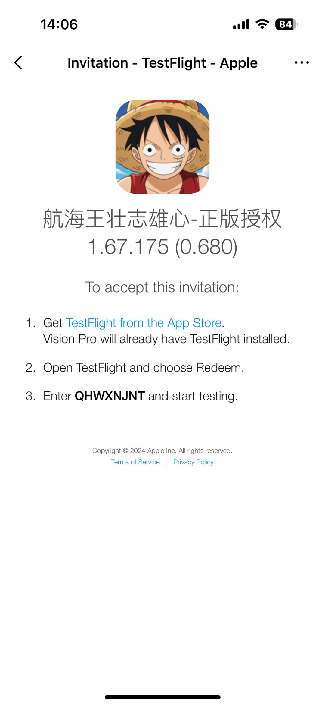 打开“TestFlight”应用,点击右上角的“兑换”按钮,输入刚刚复制的激活码,如图五,TestFlight应用内就会出现《航海王壮志雄心》的安装按钮,点击就可以下载安装了。