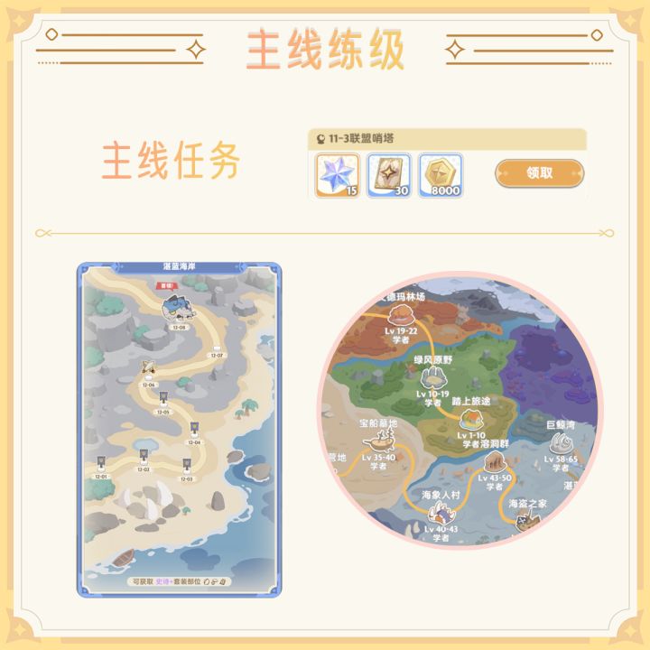 哈喽大家好,进入游戏后优先升级跑主线是我们主要的任务,毕竟只有等级达到条件后才能解锁大多数功能,而主线任务则是以地图的形式展现给我们,一张地图有8关,全部通关即可到达下一站,这里需要注意的是,主线任务的挂机经验与通关星级的关联条件。