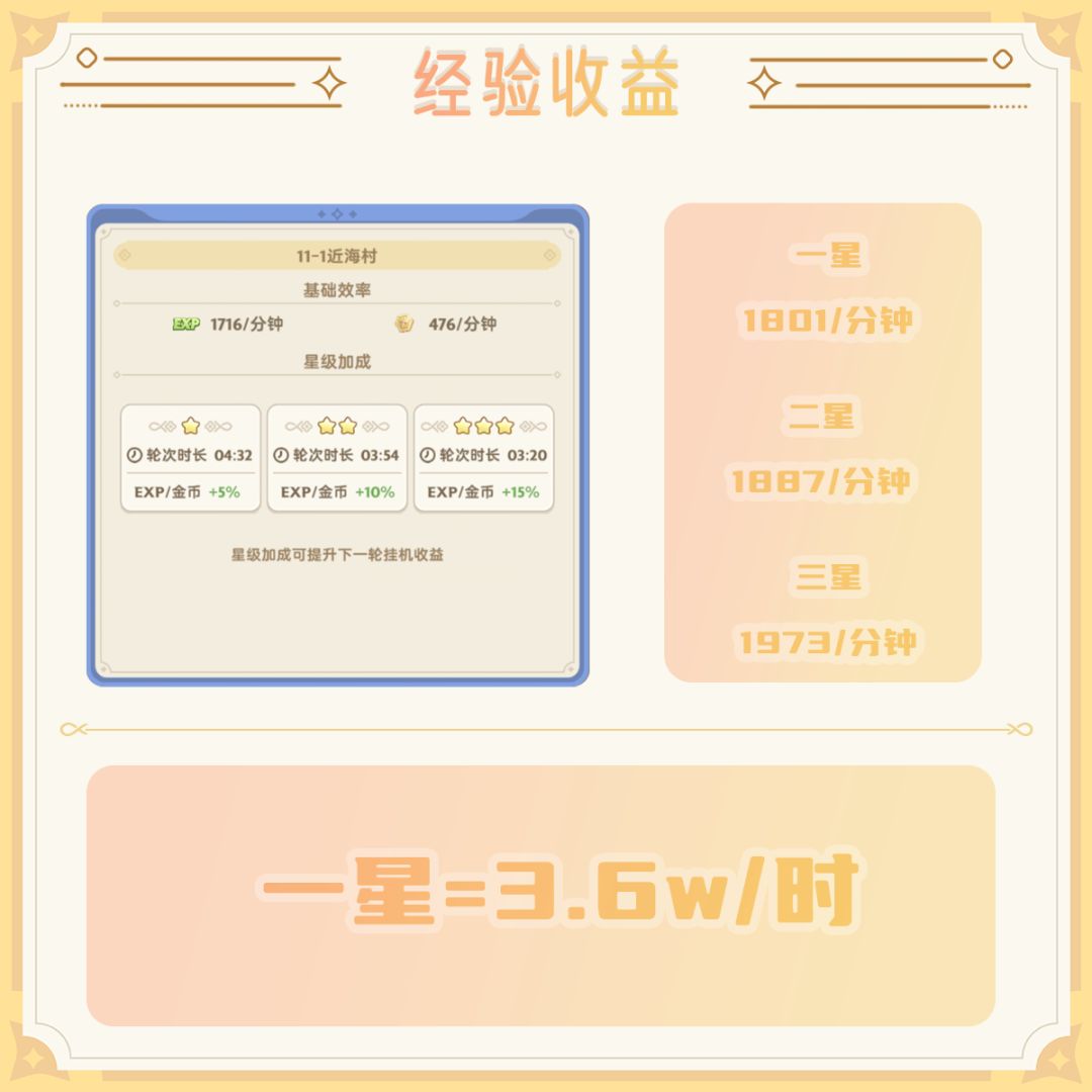 一般来说(1星+5%/2星+10%/3星+15%)这样的话我们在卡关的时候就可以选择收益更高的三星关卡来挂机练级。