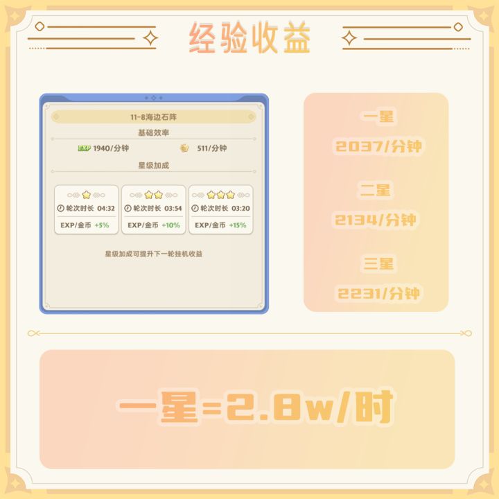这时候单看分钟还是差一点,但这里我们每轮用的时间其实是不同的(一星一轮需要4分30s,3星一轮则是3分20s)这样一小时算下来两者就近乎差了1w的经验值,11-1在这里遥遥领先。