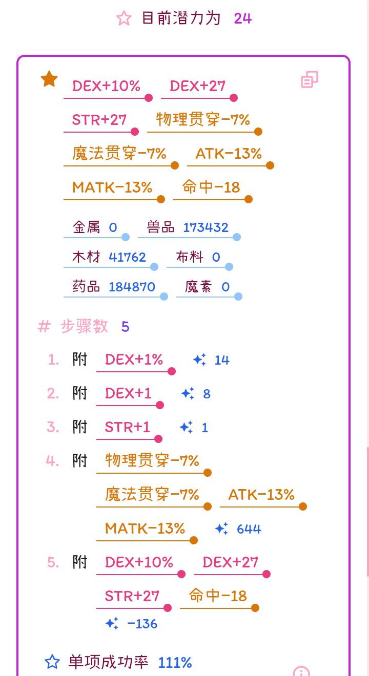 以图中附魔为例,最低潜力需求为24,不建议炸四条属性(10102727)。