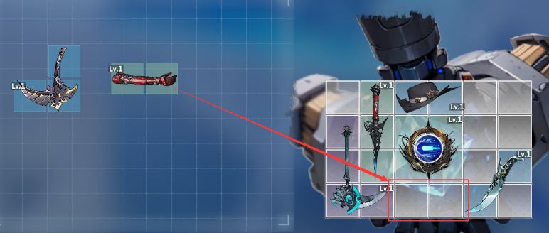 3、除了摆放效果,游戏还有一些限制要素,会根据位置的限制造成不同的效果:例如某些头盔不放在最顶格就降低50%生命、某些武器不放在最左侧就降低50%攻击等。