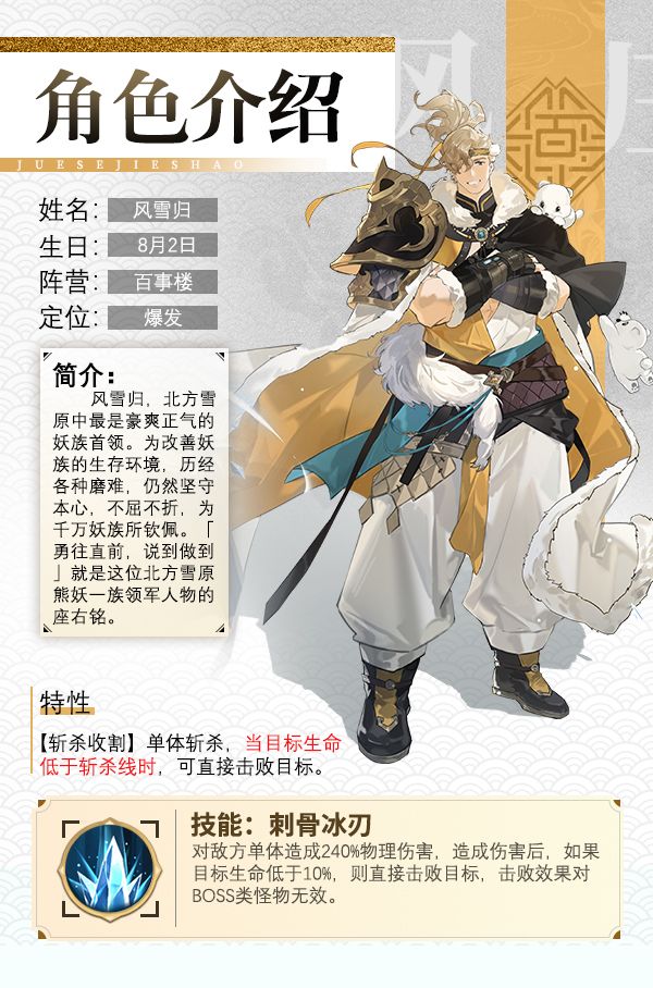 风雪归,北方雪原中最是豪爽正气的妖族首领。为改善妖族的生存环境,历经各种磨难,仍然坚守本心,不屈不折,为千万妖族所钦佩。