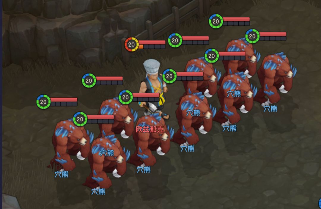 2、多使用群体攻击:2个法师的作用在于此,目的就是为了尽可能迅速减少对方熊的数量,保证我方生存压力将至最低,与此同时弓箭手与战斧斗士的群体攻击能力以及剑士的多个单体攻击能力能协助法师队部分熊进行补刀或者针对性处理。