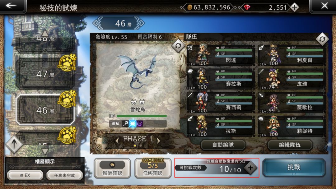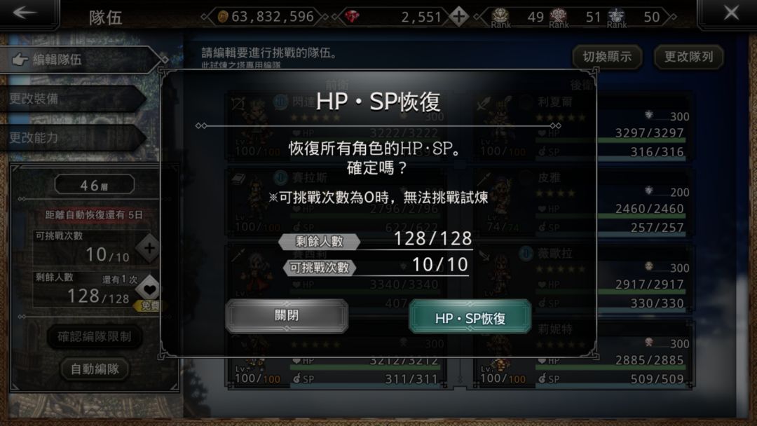挑战时会恢复全体编队的HP/SP,但挑战结束会回到原来状态。