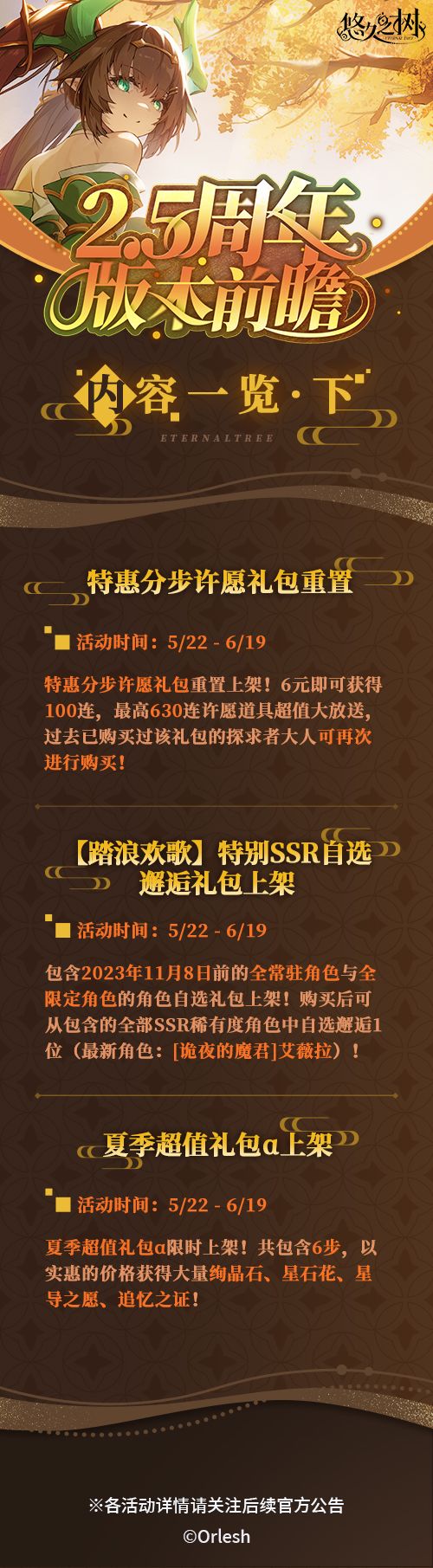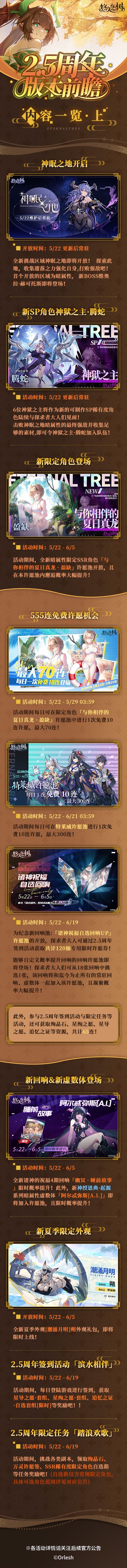 5月22日,2.5周年版本即将更新!最高555连免费许愿机会伴你迎来激情一夏,新玩法-神眠之地、新SP稀有度角色、新夏季限定角色与外观、新回响自选池待你解锁!更多精彩内容,让我们在版本内容前瞻中一睹为快吧~!