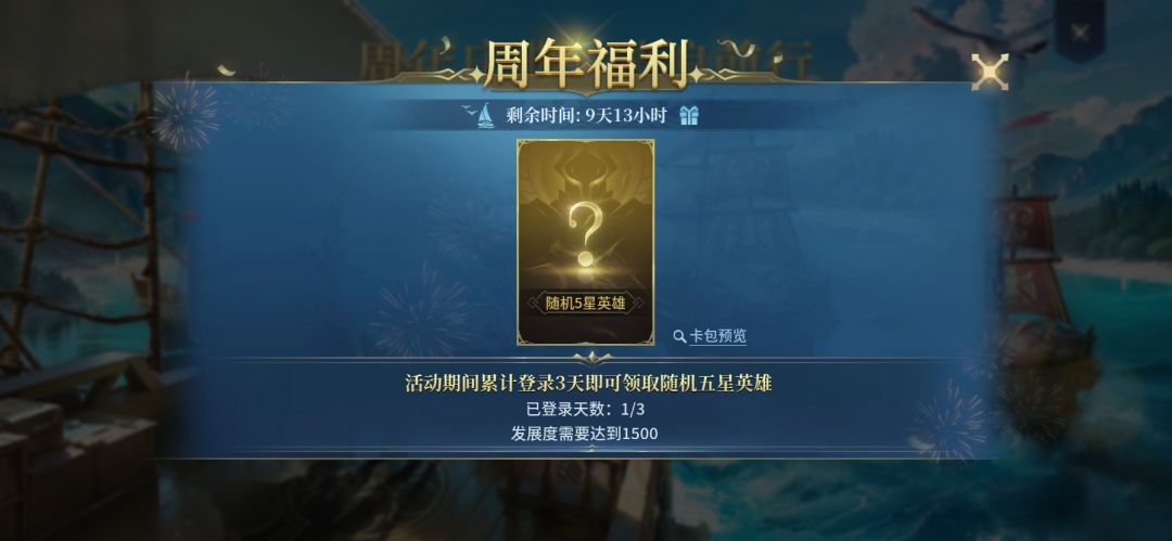 活动简介:参与周年庆典活动,每日登录游戏签到即可领取包括神恩币、金色装备、珍稀异兽蛋等丰厚奖励。活动期间累计登录3日还可直接领取5星英雄,心仪的英雄或许就在此刻出现。