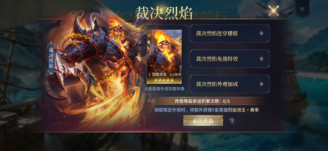 活动简介:烈焰领主限定外观“裁决烈焰”将限时返场。穿戴此外观可附带特殊效果,战斗升级,彰显不同。获取此限定外观时,还将额外获赠五星英雄烈焰领主·赛季