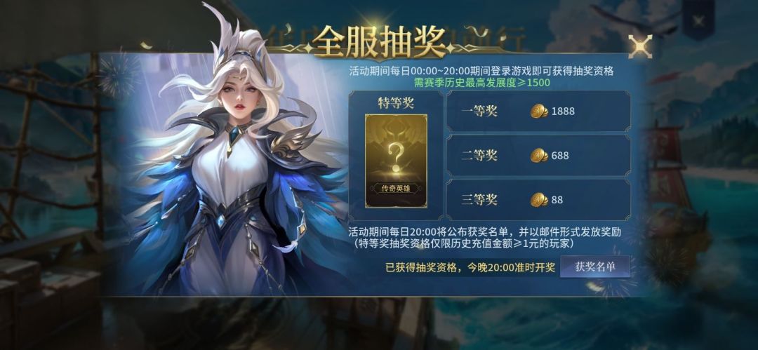活动简介:活动期间,只需在每日开奖前登录就可参与全服抽奖,并有机会获得大量金币和强力5星英雄。