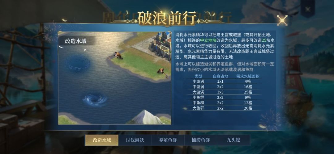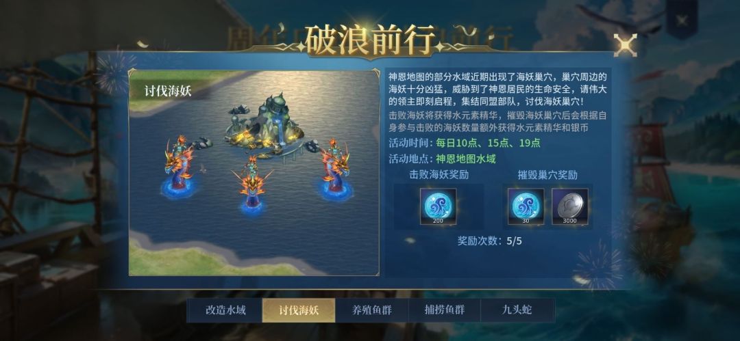 活动简介:”除妖拓海,破浪前行“,周年庆玩法正式开启!集结军队,讨伐海妖巢穴获取水元素精华,使用水元素精华即可将神恩大陆中的陆地变为水域,同时还可在其中养殖、捕捞鱼群。快来神恩大陆中建设自己的海景城堡,成为神恩渔业大亨。