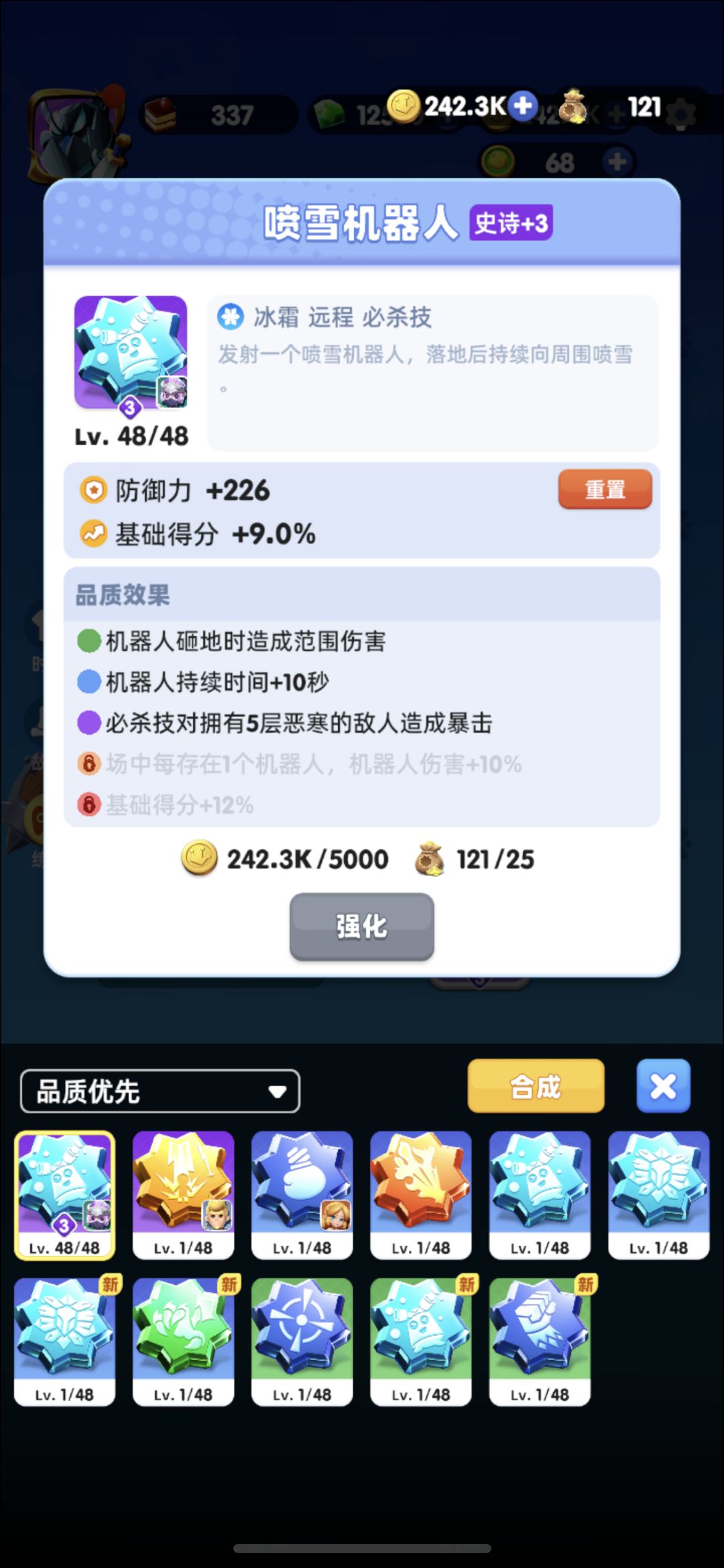 喷雪机器人蓝色品质就很好用,紫色品质更加。别看这个必杀技的描述平平无奇,但是真得好用。这个机器人有血条,可以帮你挡子弹,血条归零或者一段时间后消失,不过不要太担心机器人很快就消失。一般场面上都会存在2-3只机器人帮你输出。
