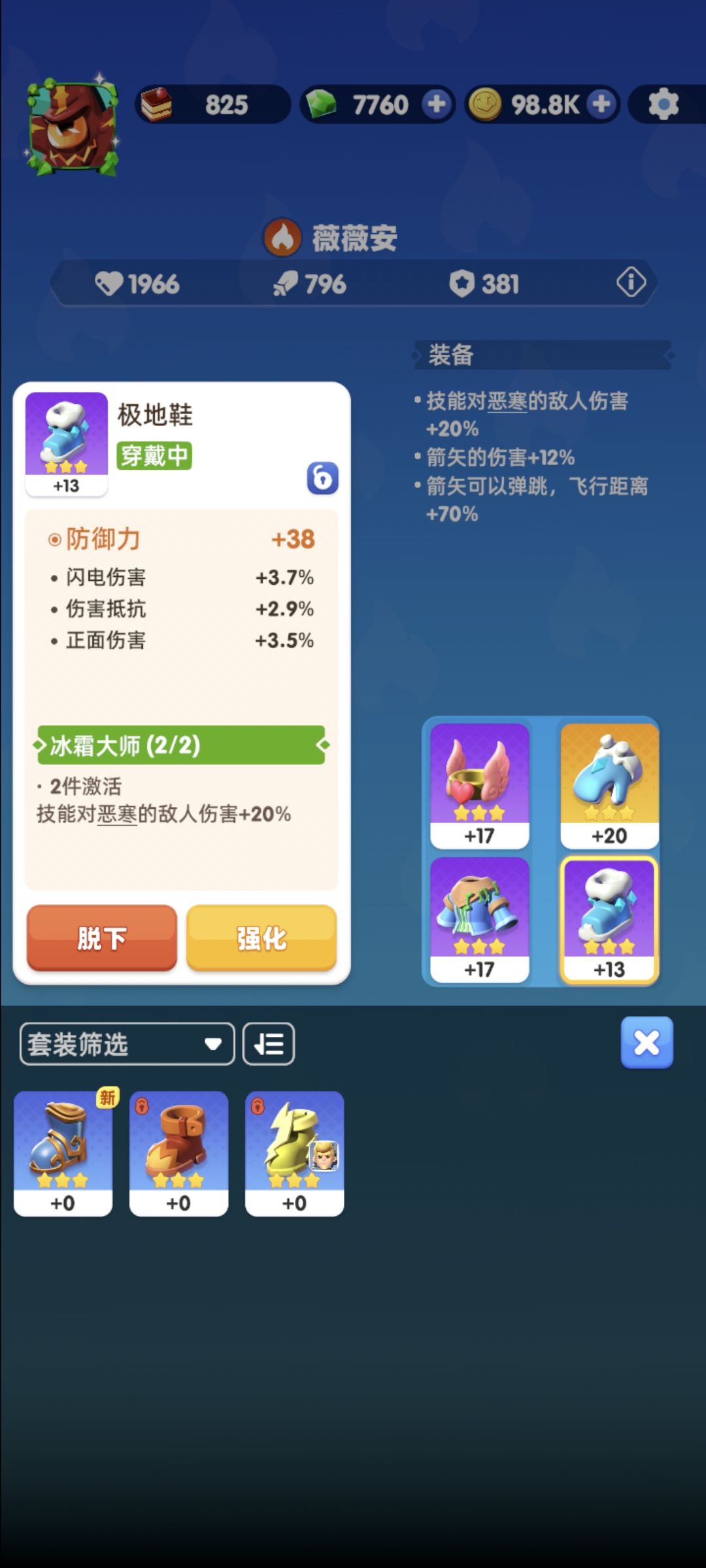 ,再一个加伤害,因为我的装备套装是技能对恶寒也算是尽可能属性多带点好配合技能卡。当然你要看你自己有什么和排行榜大佬带的什么,综合下多摸索一下。4游戏最缺什么,答案是金币,因为强化需要,升级天赋需要更多,所以需要你多买点体力去刷悬赏。