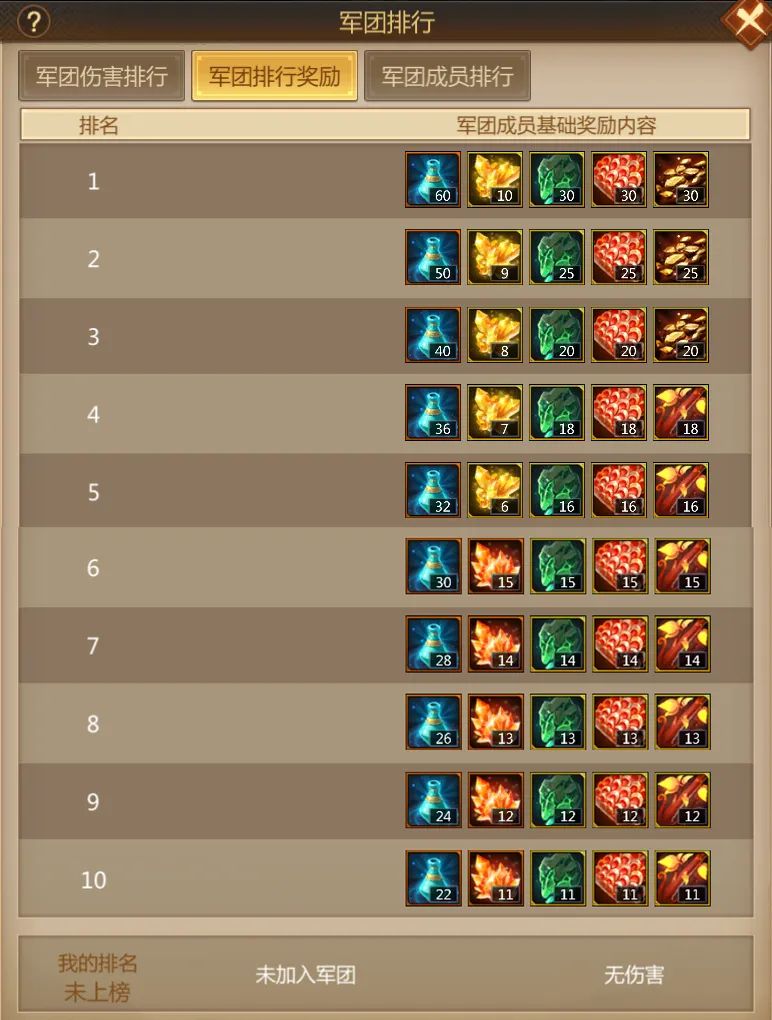 *注:根据各个排名的军团内成员的奖励为——排行1-10名可获得3倍基础奖励,11名-20名可获得2倍基础奖励,21名及之后可获得1倍基础奖励。
