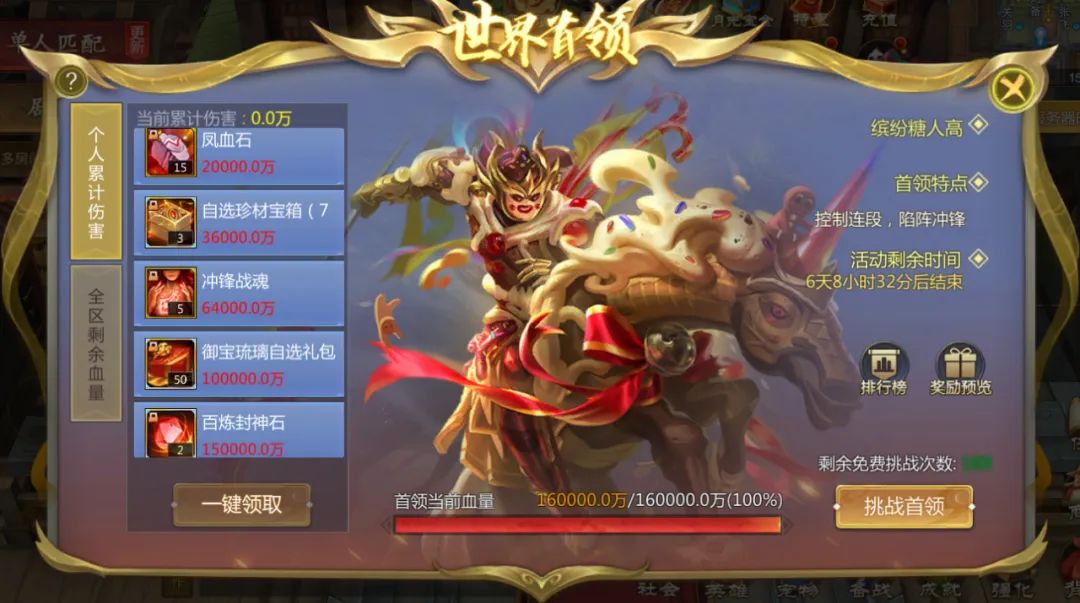 个人对世界首领造成的伤害达到一定值时,可逐步解锁各种奖励,输出越高,奖励越丰富!