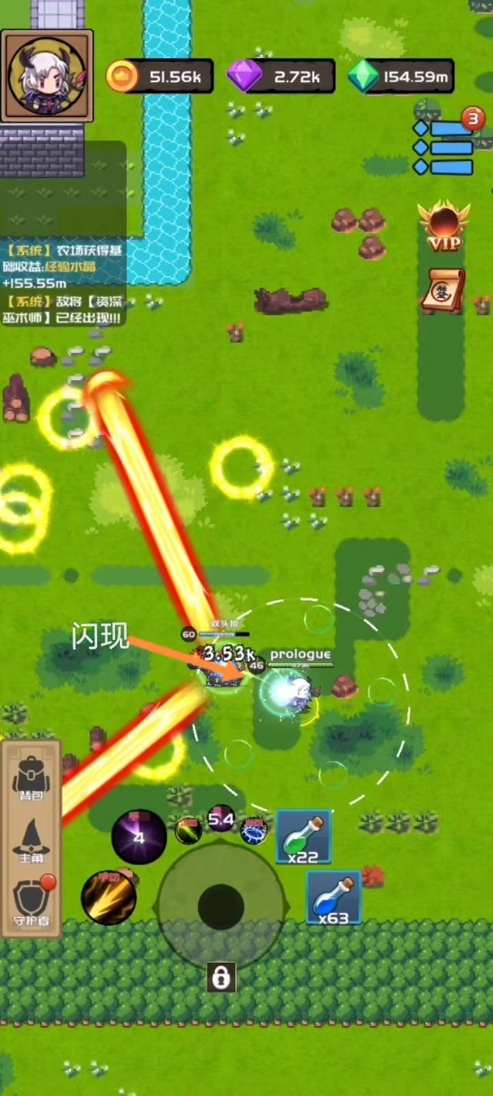 这里选择反向角度走位 躲避冲锋技能 、 图2时 狼王第3招大范围扫火技能, 角色安全闪现到狼王身后