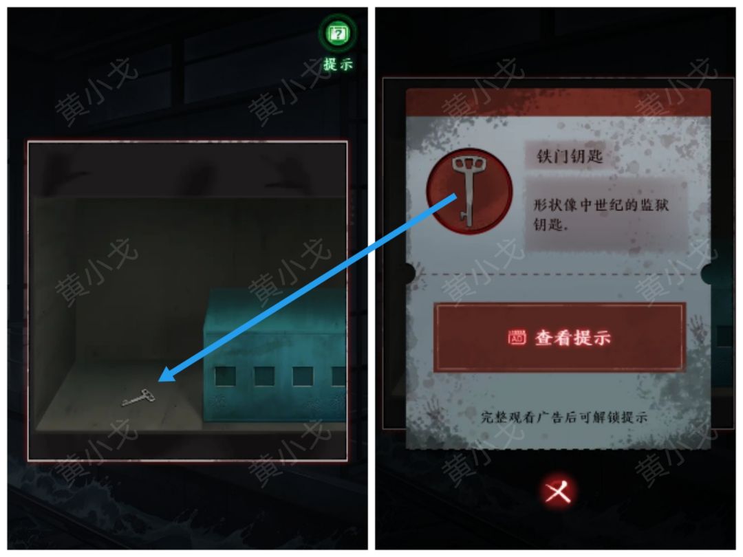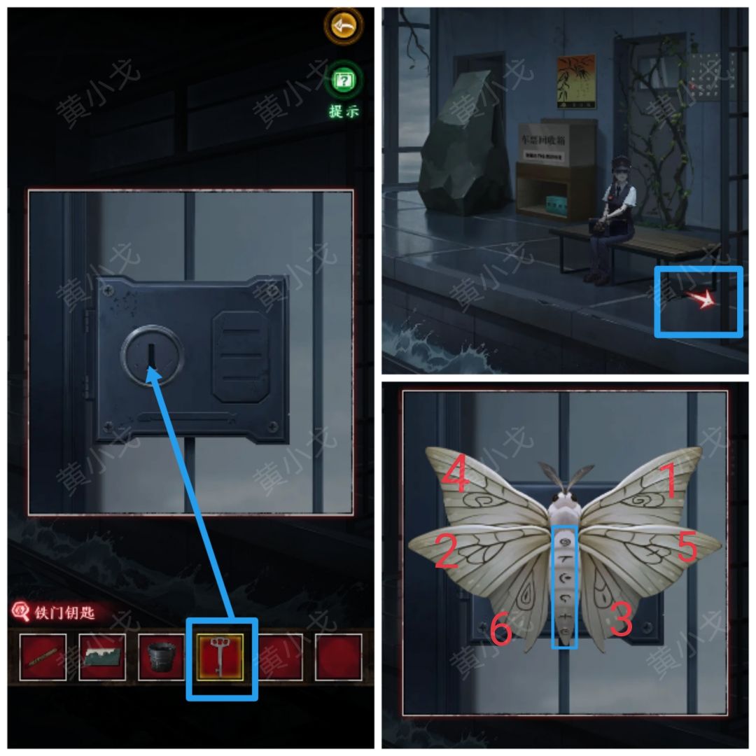 14.点击铁门上的飞蛾机关,根据飞蛾身上的符号顺序,结合飞蛾翅膀上的符号,按顺序按下飞蛾翅膀,飞蛾飞走;用【铁门钥匙】打开铁门