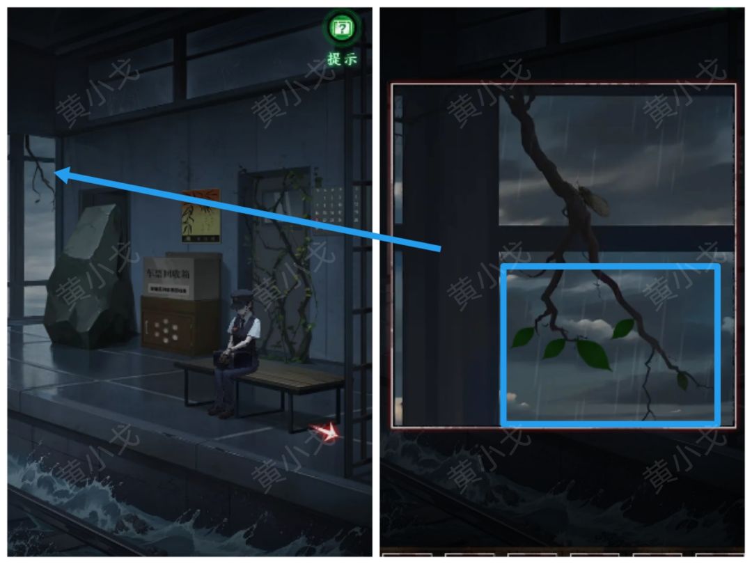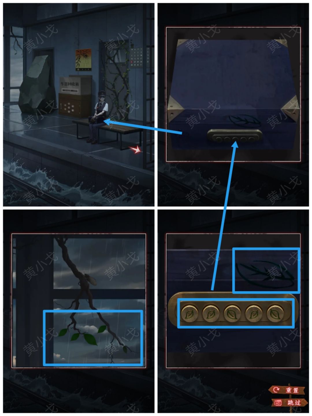 6.点击列车员怀中的箱子,根据上面的提示(叶片图案),结合树枝上的叶片线索,调整密码锁(左左右左右)