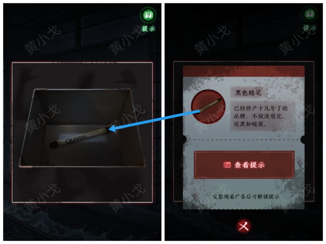 22.点击刚才的拼图,用【红色蜡笔】和【黑色蜡笔】涂色;打开匣子,获得【钥匙】