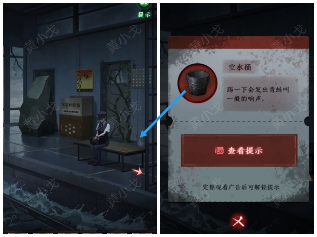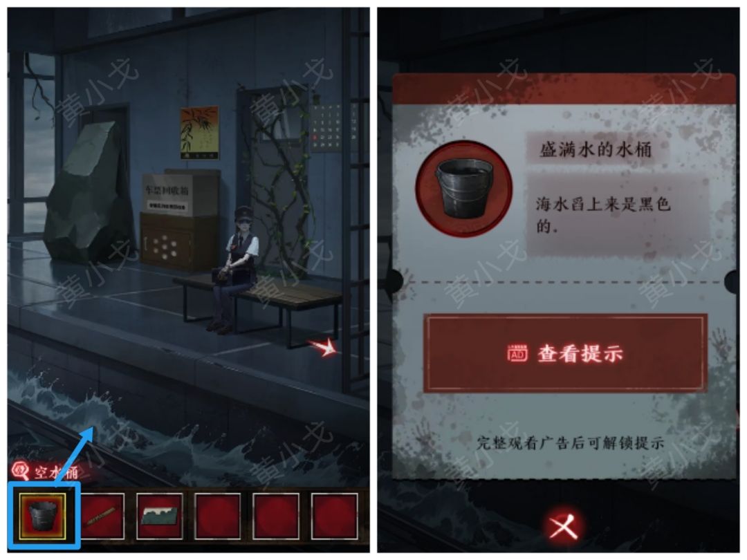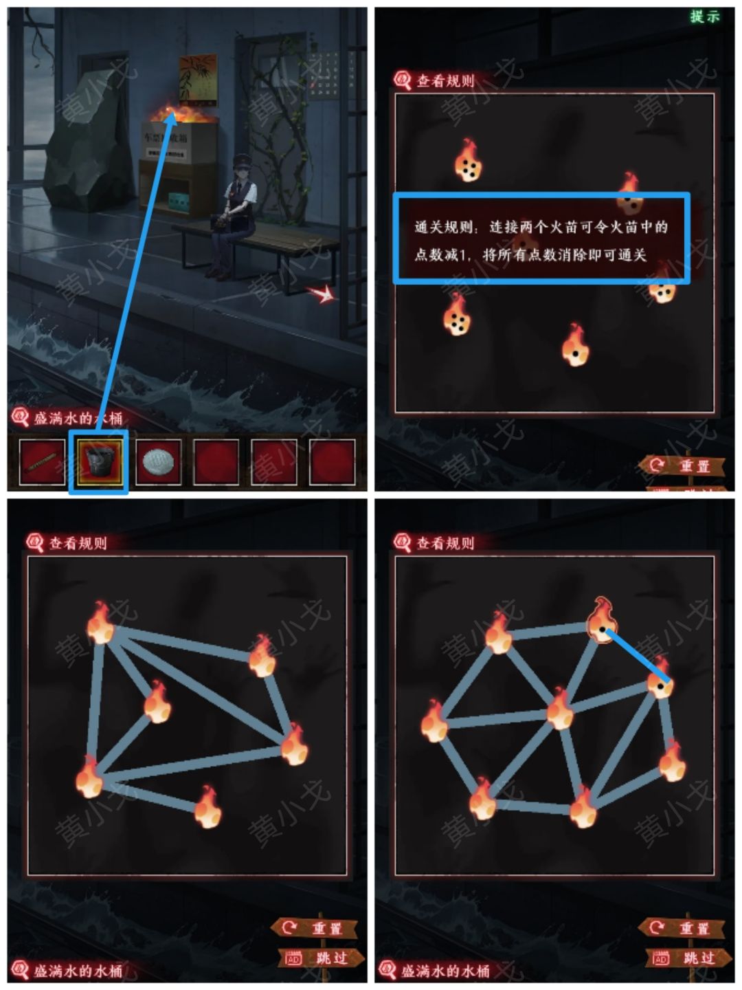 20.(站台-左)对着火的车票回收箱使用【装满水的水桶】;查看游戏规则,完成两次小游戏
